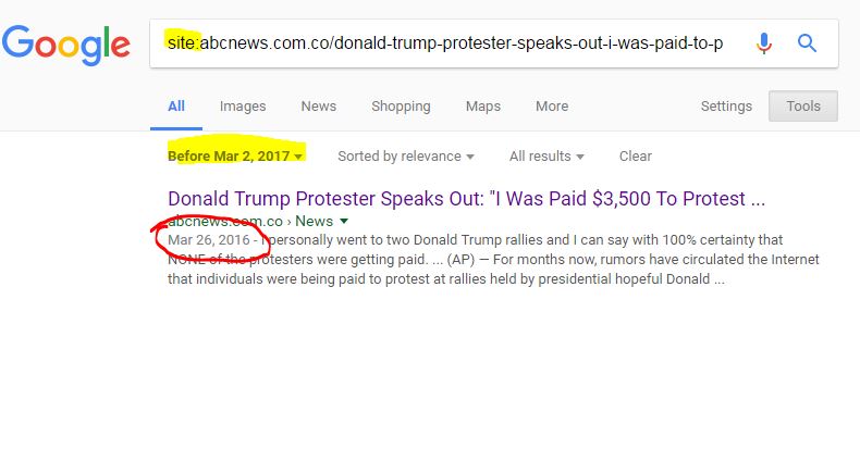 We can’t get there exactly but we can often use Google to get close. Google stores the date of the first time it indexed a page–on popular sites this date is usually within a couple days of the true publish date (on unknown sites it is much less reliable).