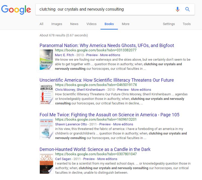 So we go to Google Books and we pick out just a short snippet of unique phrasing. I’m going to choose “clutching  our crystals and nervously consulting.”